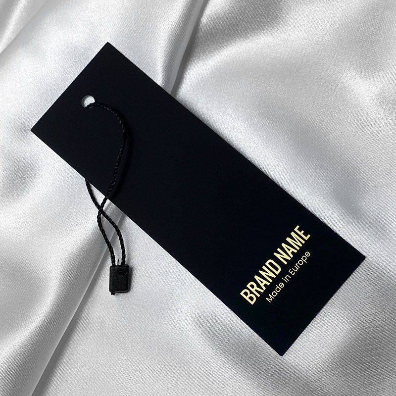 Štítek na oblečení nebo oděvní doplňky, vyrobený na zakázku z černého kartonu Soft Touch, upravený stříbrnou fólií s názvem značky nebo logem. Tento typ visačky je vyroben z vysoce kvalitních materiálů za použití nejmodernějších technologií v oblasti digitálního tisku a dokončovacích prací.