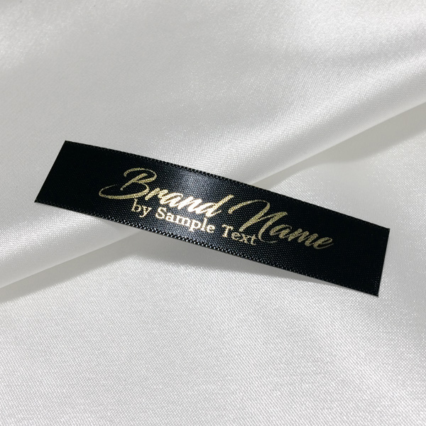 Textilní etiketa s potiskem vlastních textů na saténové látce, střižená podle předložených rozměrů.