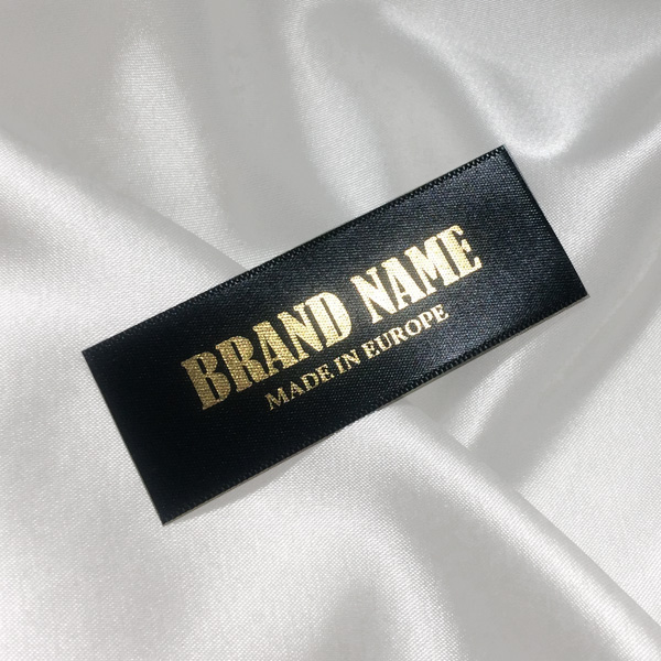Látkový štítek s potiskem názvu značky se zlatým písmem na jemném saténu černé barvy, vhodný na oblečení. Tento typ textilní etikety je vyráběn pomocí nejmodernějších technologií v oblasti digitálního tisku na textil. Etikety jsou tištěny na speciální saténovou podložku metodou termotransferu, která zajišťuje vynikající kvalitu tisku a vysokou odolnost proti praní.