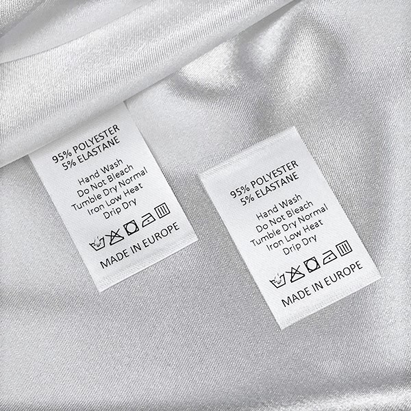 Štítek pro péči o prádlo se symboly údržby a praní, přizpůsobený název značky a složení materiálu, vytištěný na jemném bílém saténu. Tento typ textilní etikety se vyrábí pomocí nejmodernějších technologií v oblasti digitálního tisku na textilní podložku. Etikety jsou tištěny na speciální satén termotransferovou metodou, která zajišťuje působivou kvalitu tisku a vysokou odolnost proti praní.